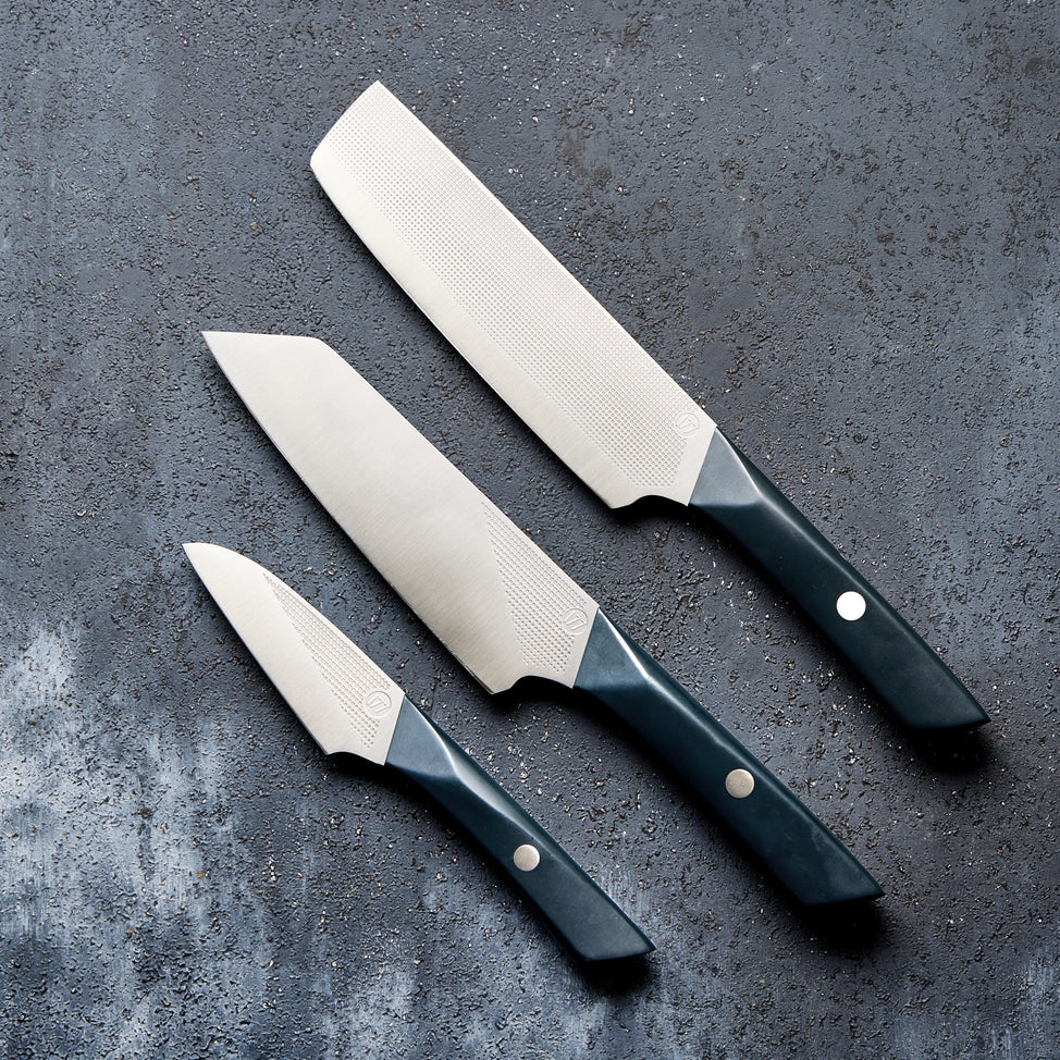 Meet the knives that make the perfect starter set: the Milk Street Kitchin-kiji, a compact utility knife for “in-between” jobs; the Nakiri knife, designed for safe, fast vegetable prep and our hybrid-style Bunka, engineered with a chisel-like tip.