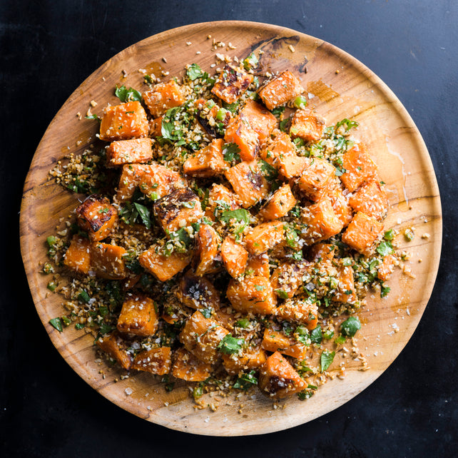Crunchy nuts, spices and refreshing herbs lighten earthy sweet potatoes.