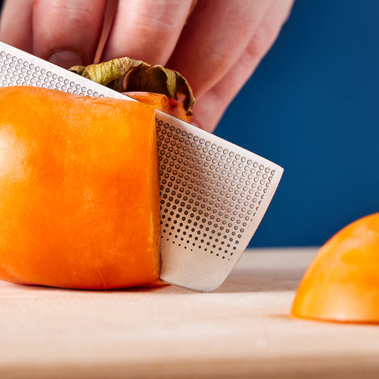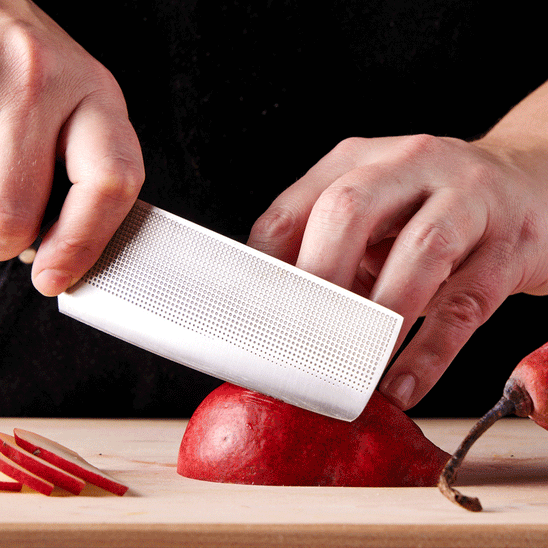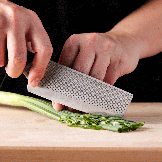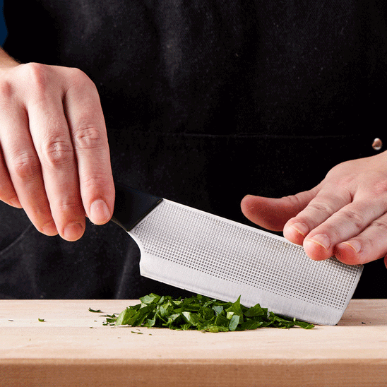I own a dozen different nakiris in all shapes and sizes and this one really hits the spot. The length-to-height ratio of the blade means that it works equally well for detail-oriented tasks or chopping my way through a pile of vegetables. Unlike many smaller knives that can feel awkward on the cutting board, the blade’s gentle taper and curved tip feels finely tuned for fluid, comfortable slicing and dicing, which is rare in a small knife. I love how light it is and how thin the blade gets, which coupled with the non-stick makes perfectly sliced garlic easy.